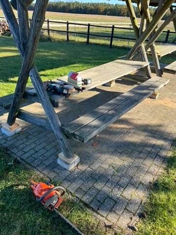 Auf dem Festplatz widmete man sich gleich mehreren Projekten. Besonders erwähnenswert ist die Umwandlung der ehemaligen Kegelbahn in eine neue, extralange Sitzbank. Die stabilen Holzbretter wurden aufbereitet, montiert und so sinnvoll wiederverwendet. Zusätzlich wurden die bekannten „Futterkrippen“-Sitzgelegenheiten auf dem Festplatz neu ausgerichtet, begradigt und auf Steine gestellt – ein kleiner, aber wichtiger Beitrag für Sicherheit und Langlebigkeit.
