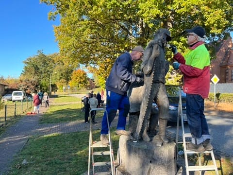 Ein weiterer Schwerpunkt war die Pflege der bekannten Holzstatue im Ortszentrum. Diese erhielt eine gründliche Reinigung und eine frische Schicht Holzschutz. Mit viel Sorgfalt wurde gearbeitet, um das Kunstwerk langfristig zu erhalten. Der Einsatz zeigte eindrucksvoll, wie mit vereinten Kräften Kultur und Handwerk im Dorf gepflegt werden können.